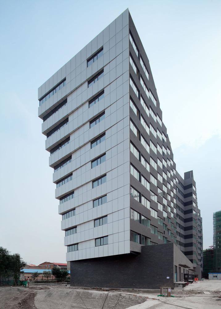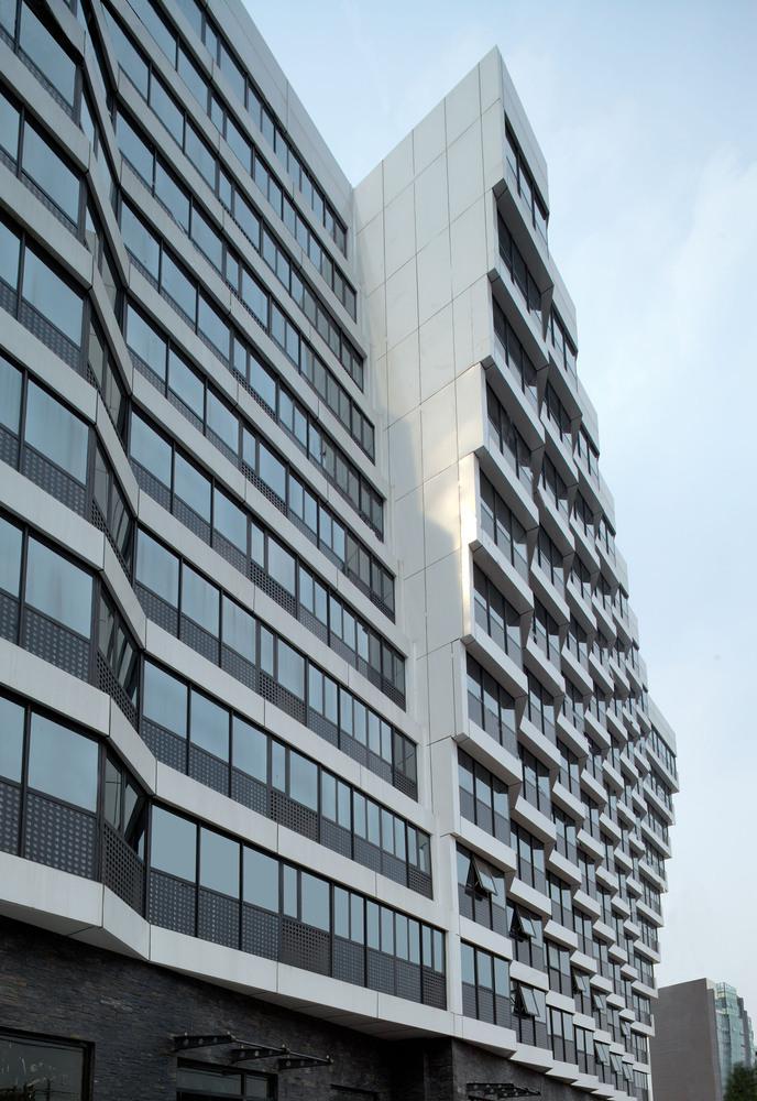 建筑的底層是展廳和商業(yè)。公寓部分在二層以上,大約占總建筑面積的三分之二,因分屬于三個(gè)投資人,業(yè)主希望從形式上有區(qū)分,突出各自的獨(dú)立性。我們以公寓面寬為基準(zhǔn)定義出一個(gè)標(biāo)準(zhǔn)戶型的外觀形式,在南立面上進(jìn)行重復(fù),通過基本單元有序的懸挑形成錯(cuò)動(dòng),發(fā)展出水平和垂直方向富有動(dòng)感的體量變化,進(jìn)而強(qiáng)調(diào)出辦公和兩部分公寓的清晰分界。于是集合體明確地呈現(xiàn)出四部分,一個(gè)底座和上面三個(gè)起伏的體塊,為內(nèi)容的不同提供了明顯的標(biāo)識(shí)。