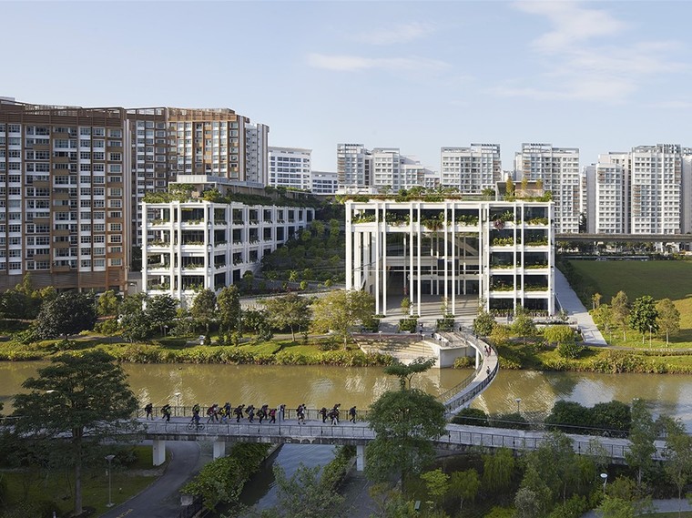 朝向水岸的風(fēng)雨廣場是社區(qū)中充滿活力的核心地帶,可以用于各種類型的社區(qū)活動和事件。廣場連接了貫穿場地的東西向和南北向道路,同時與附近的Oasis輕軌站相連接,從而成為社區(qū)中重要的交通節(jié)點。建筑的每個立面都充斥著綠植,與環(huán)繞在餐廳和醫(yī)院外部的涼廊共同在室內(nèi)和室外之間形成一層“濾網(wǎng)”,使陽光和自然風(fēng)柔和地透入內(nèi)部空間,從而讓整個建筑呈現(xiàn)出一種輕盈而開放的感覺。思銳建筑事務(wù)所的主創(chuàng)建筑師Christopher Lee表示:“我們的設(shè)計借鑒了新加坡住房和發(fā)展委員會在上世紀(jì)70-80年代開發(fā)的住宅建筑中常見的開放式框架,并基于景觀環(huán)境將這種框架轉(zhuǎn)變?yōu)橐粋€更加輕盈和開放的、能夠捕捉和容納各類社區(qū)功能的系統(tǒng)——這是一座為社區(qū)生活的展開而打造的建筑?!?/P>