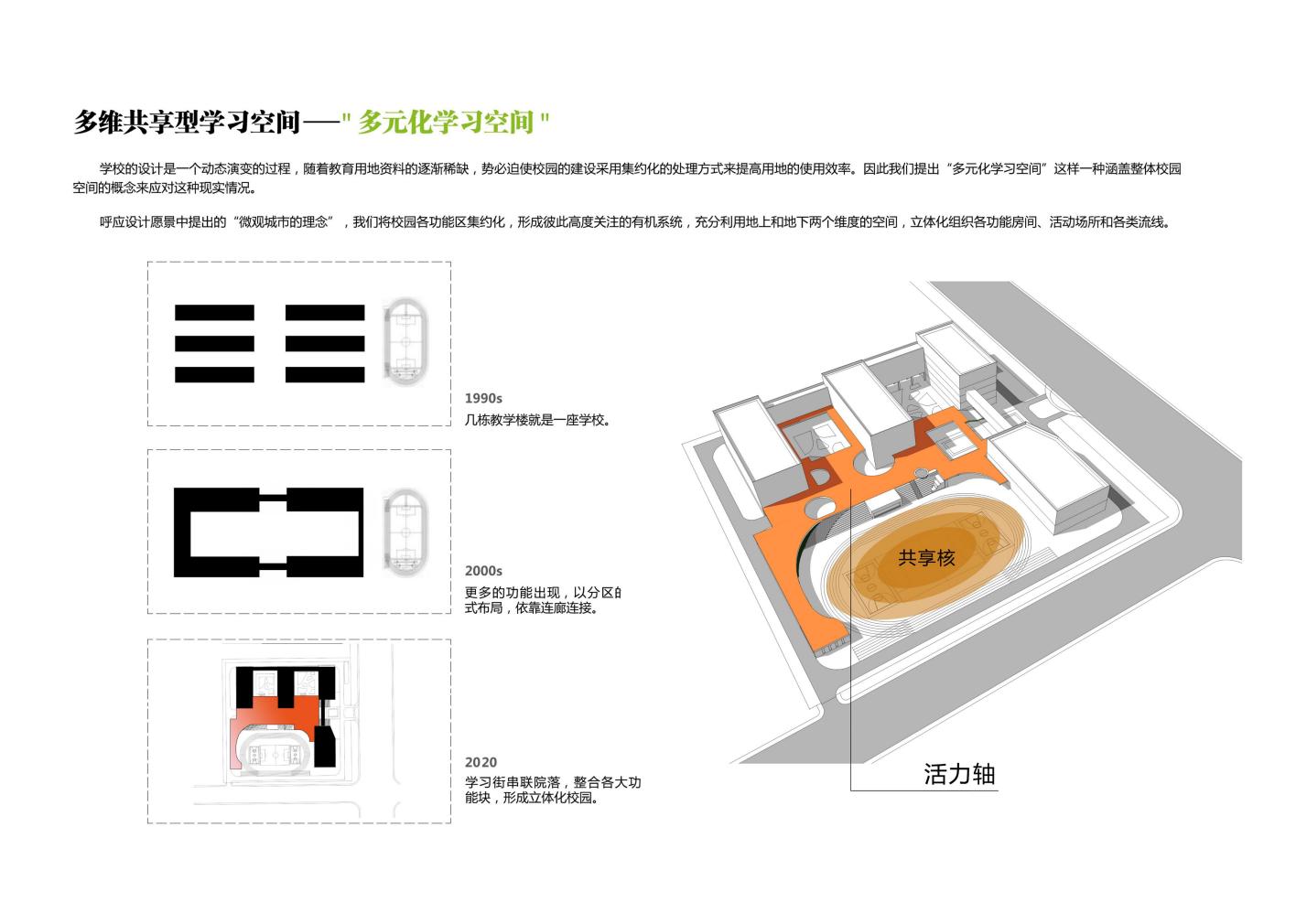 位于學校西側的三棟普通教學樓,形成行列式的擺放布局,建筑面積共計13200平方,共設置60口普通教室,連廊相連,雙面布房,南側全部為普通教室,北側為專用教室,教學及行政辦公室以及衛(wèi)生間。共設置2個計算機教室,2個科學教室,1個錄播室,1個書法教室,1個綜合活動實踐室,1個網(wǎng)絡中心,1個德育展覽館,1個容納60人以上的會議室,多個行政辦公室與教師辦公室,專用教室滿足省規(guī)90平的使用面積要求,輔房滿足24平的使用面積要求。整個學校設計用了較少的地上土地,滿足了較充足的使用需求,也增加了學生學習生活的趣味性,建筑外觀上利用現(xiàn)代科技手法體現(xiàn)活力,簡潔純粹,體塊分明,釋放學生學習玩樂的天性。