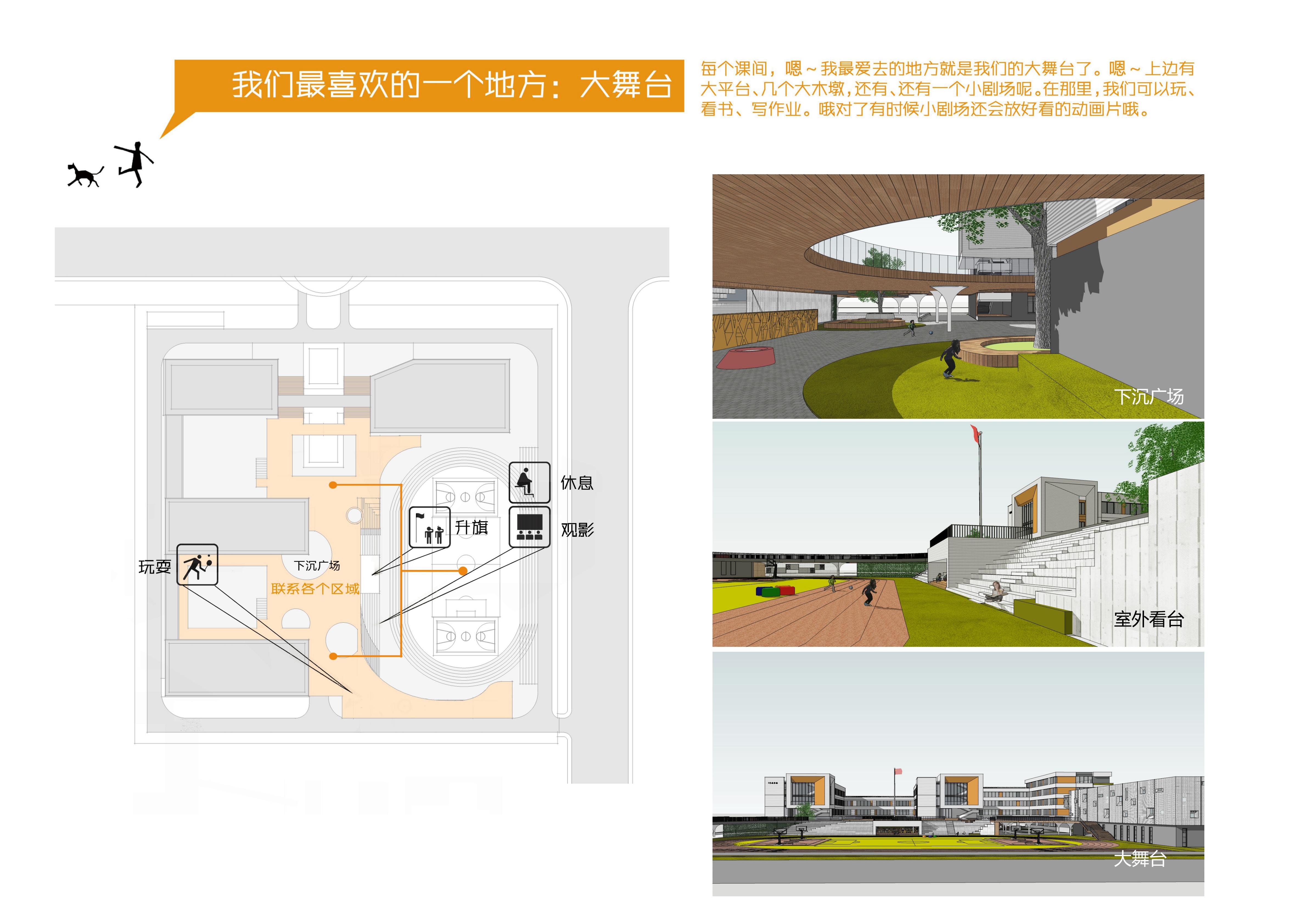“雙地下”概念是將操場以下的土地進行有效利用,將2F綜合樓地下以及操場地下一層作為食堂使用,內(nèi)部包含廚房以及教職工食堂,建筑面積為5460平方,可容納3000人。將食堂的北側以及西側設置6M以上寬的下沉庭院,解決食堂的采光通風問題,也結合樓梯踏步與景觀設計增加學生的趣味性。第二個地下就是學校西側地下一層作為教師的內(nèi)部停車庫,可停放200輛車輛,面積為7500平,操場的地下二層設置地下接送系統(tǒng),作為家長接送孩子的專用停車庫,可停放160輛車輛,面積為5200平方,內(nèi)部設置閘機,家長等候區(qū),閱讀區(qū),學生刷卡出校后家長手機會接收到短信,便捷的接送到孩子。緩解了學生上下學學校附近的交通壓力。